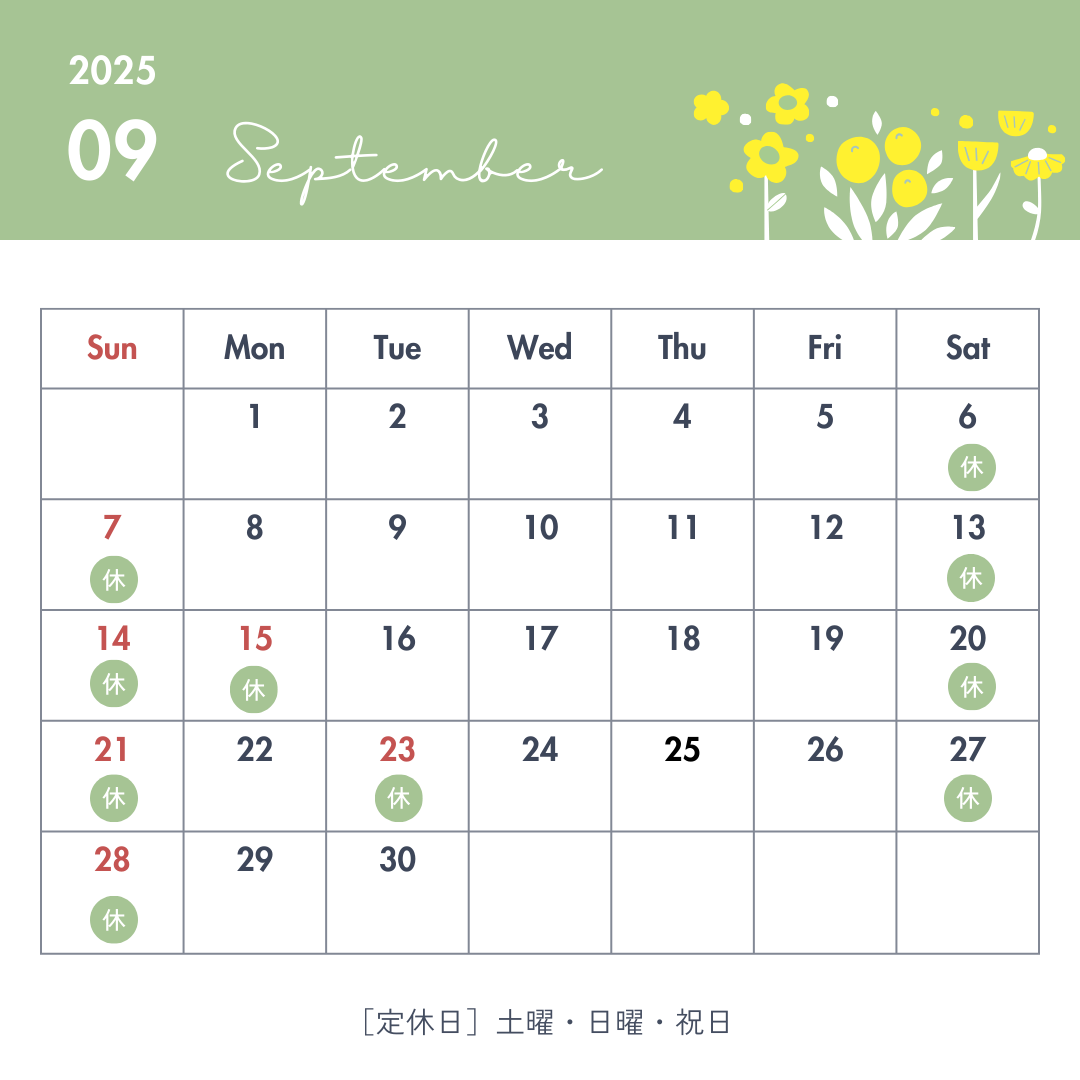 9/16(月・祝)敬老の日、9/23(火・祝)秋分の日もお休みです。