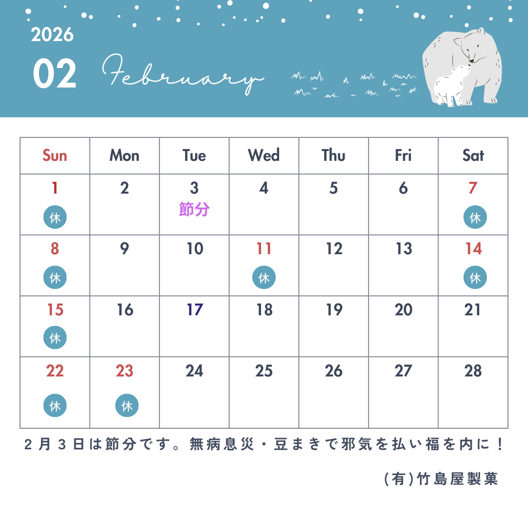 お知らせ お知らせWhat's News 雪は大分収まってきました。 2026.02.04 いつもホームページを見て頂きありがとうございます。 雪もかなり落ち着きました! 久しぶりのお日様が本当に有難いです。 節分が終わってからも勿論、 今日も美味しいお豆製造しております。 ご依頼おまちしております。 前へ戻る